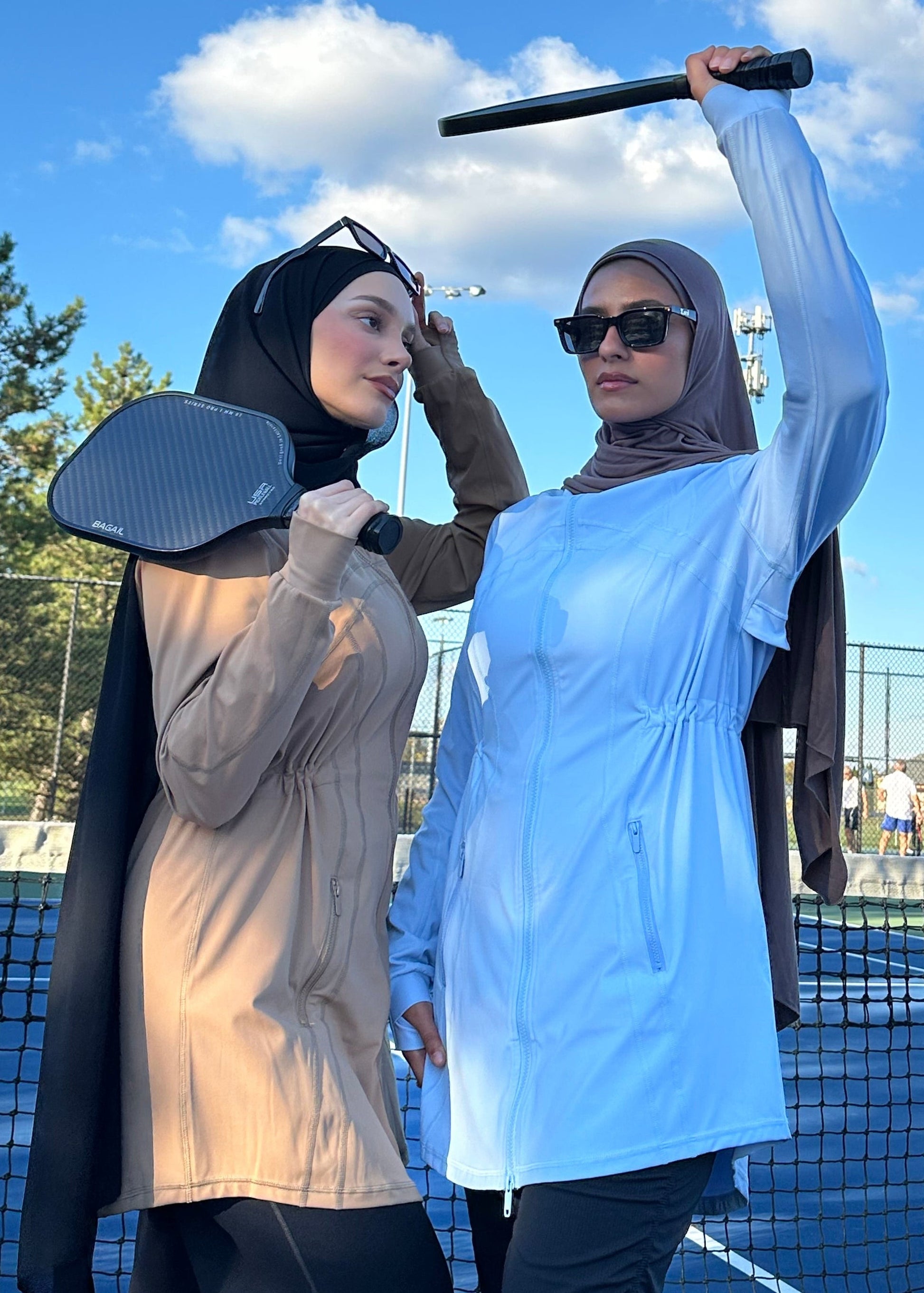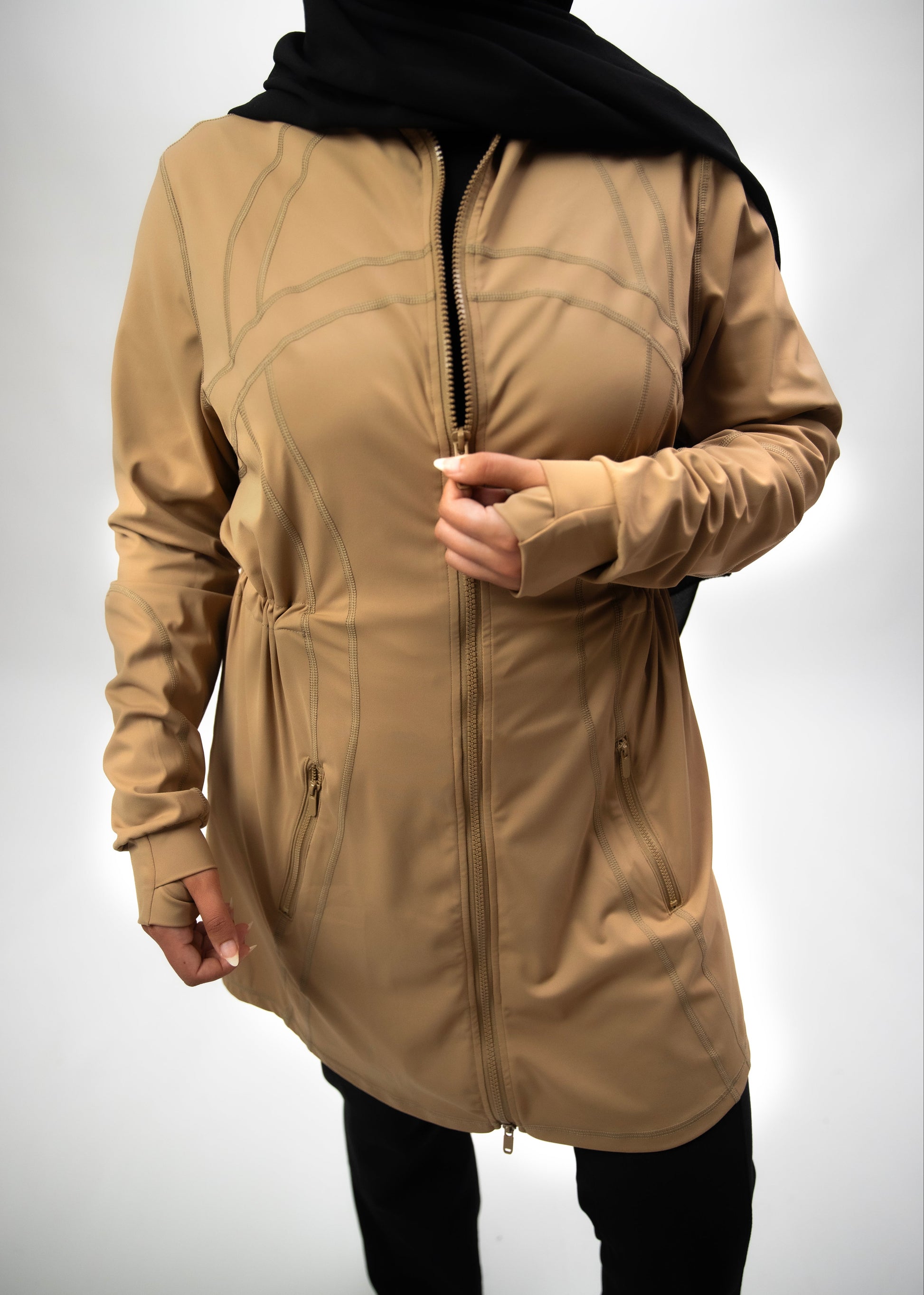 Designed for the woman who moves with purpose. Featuring a longline silhouette, soft-stretch fabric, and a cinched back waistband for a flattering shape, it’s perfect for layering before or after your workout or anytime you want to feel comfortable and confident in motion. With thumbholes for added comfort and coverage, clean stitching throughout the bodice, and a fit that moves with you, this jacket redefines modest athletic wear.